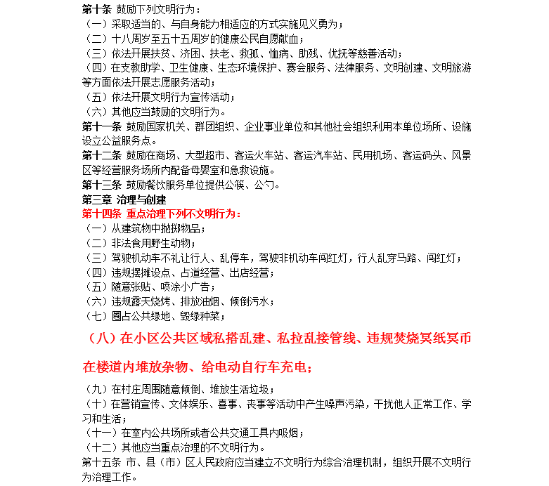 在積極倡導(dǎo)文明行為的同時也要加強(qiáng)整治“高空拋物;駕駛機(jī)動車不禮讓行人、亂停車,駕駛非機(jī)動車闖紅燈,行人亂穿馬路、闖紅燈;在小區(qū)公共區(qū)域私搭亂建、私拉亂接管線、違規(guī)焚燒冥紙冥幣在樓道內(nèi)堆放雜物、給電動自行車充電”等一系列不文明行為。