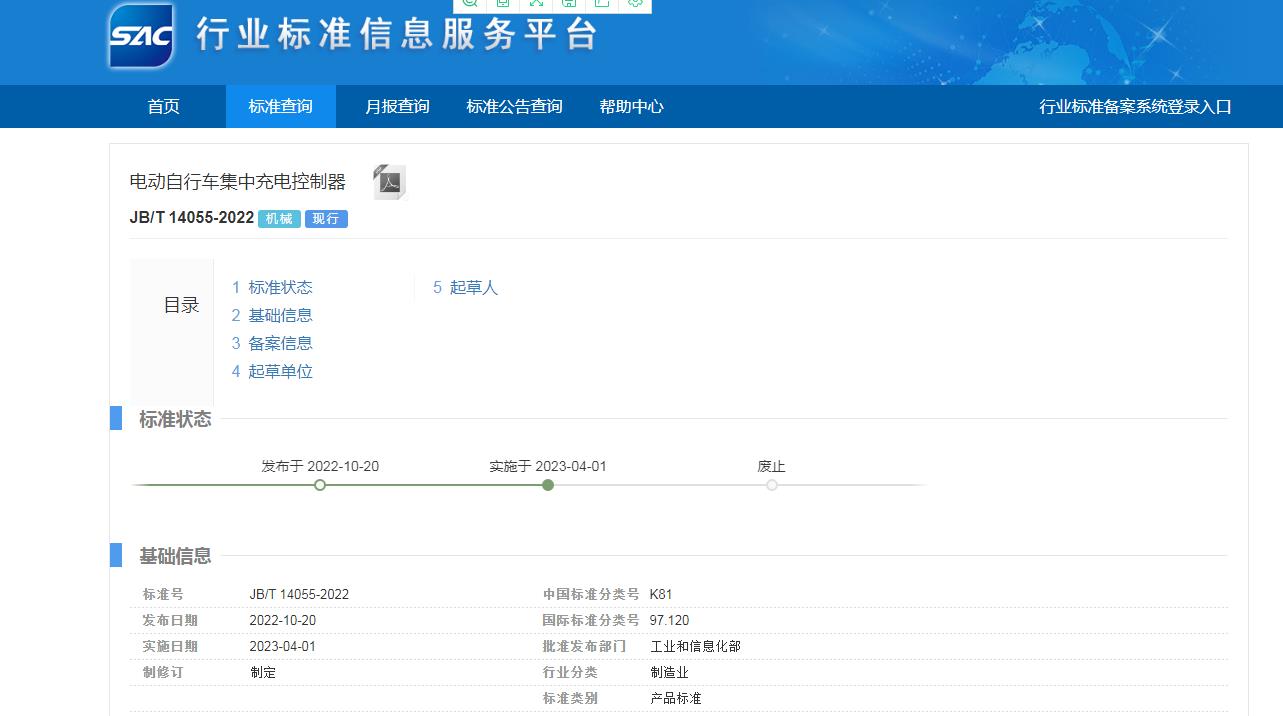 近日,由鄭州市質量技術監督檢驗測試中心、蕪湖山野電器有限公司、中移物聯網有限公司、中國電器科學研究院有限公司等單位共同起草制定的《電動自行車集中充電控制器》行業標準,已獲得工業和信息化部的批準并正式對外發布。該標準將于2023年4月1日正式實施!
