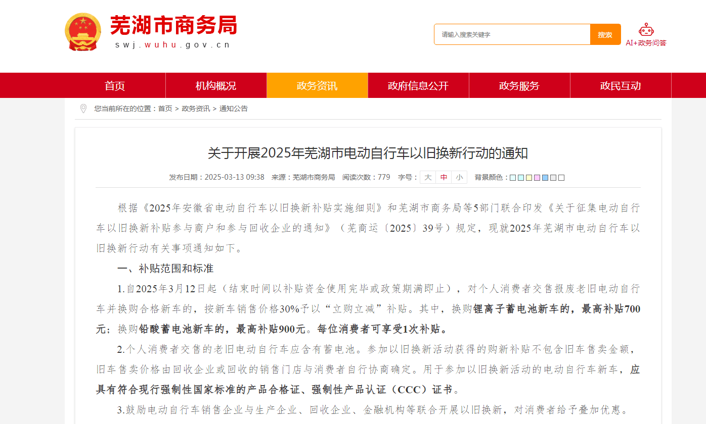 為推進綠色出行,助力市民淘汰老舊電動車,蕪湖市商務局聯合多部門推出2025年電動自行車以舊換新國補政策 ,3月12日起起試運行!最高可省900元,操作簡單,立購立減!本文將為你劃重點、教操作,一文讀懂如何領補貼!