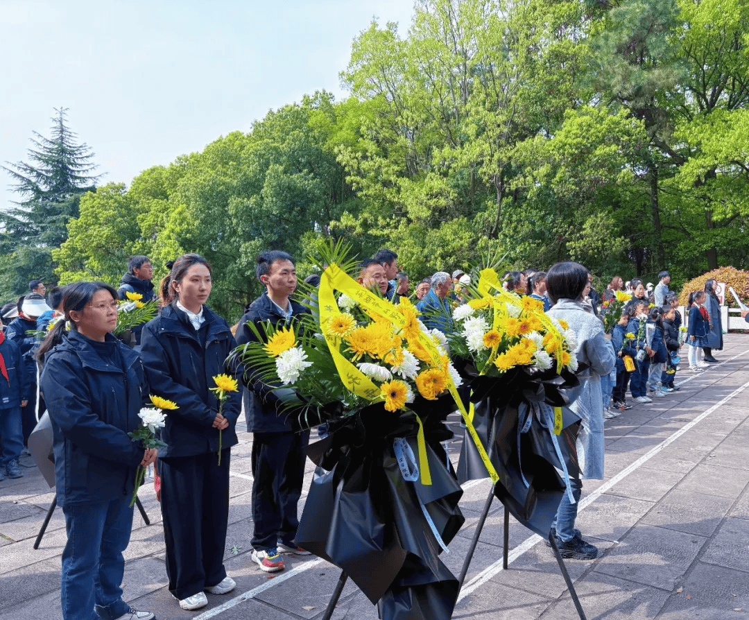 上午8:30,大家一同乘車前往烈士陵園。在巍峨的烈士紀念碑前,支部書記帶領大家肅立默哀,并向革命先烈敬獻花圈。全體人員手持菊花,依次緩步繞行紀念碑一周,瞻仰烈士墓區,將鮮花輕放在墓碑前。一朵朵菊花承載著對英烈的深切緬懷,一次次鞠躬傳遞著對英雄精神的永恒傳承。